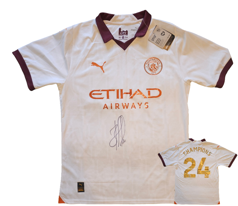 The authentic Puma away shirt as worn in the 2023/24 season features gold CHAMPIONS 24 print and is signed to the front in black marker and would make the perfect addition to any MCFC collection.