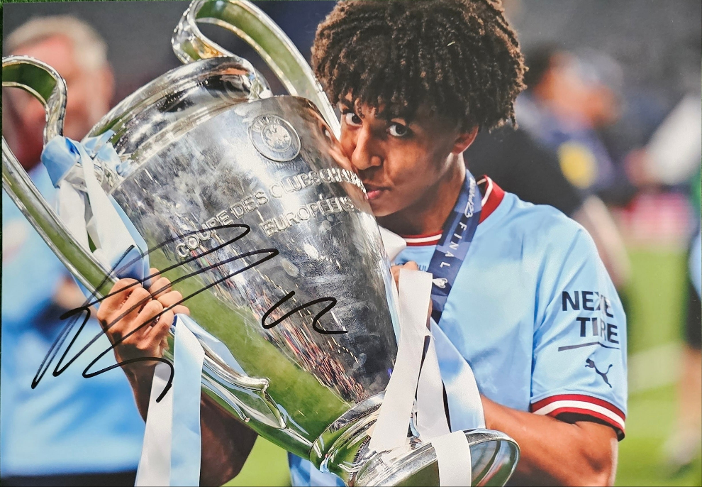 A4 photo signed by Manchester City's English wonderkid, Rico Lewis.